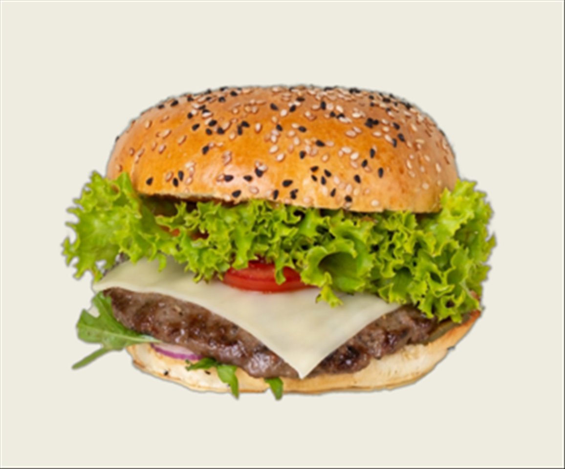 mit selbstgemachtem Rindfleisch Filet, Cheddarkäse, Salat, Tomaten, Gurken, Zwiebeln und Burgersoße