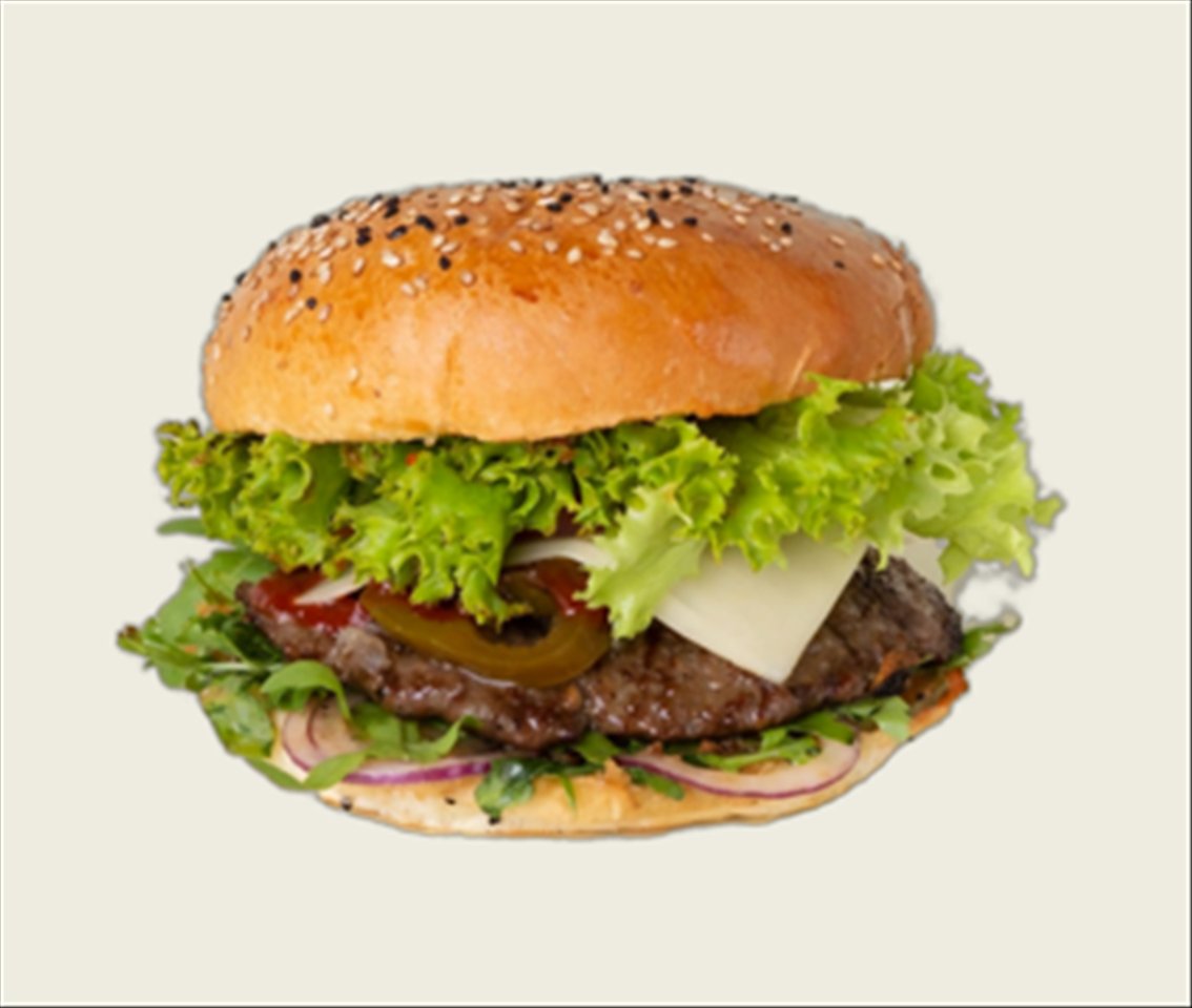mit selbstgemachtem Rindfleisch-Patty, Jalapeños, Cheddarkäse, Salat, Tomaten, Gurken, Zwiebeln und hausgemachter Burgersoße
