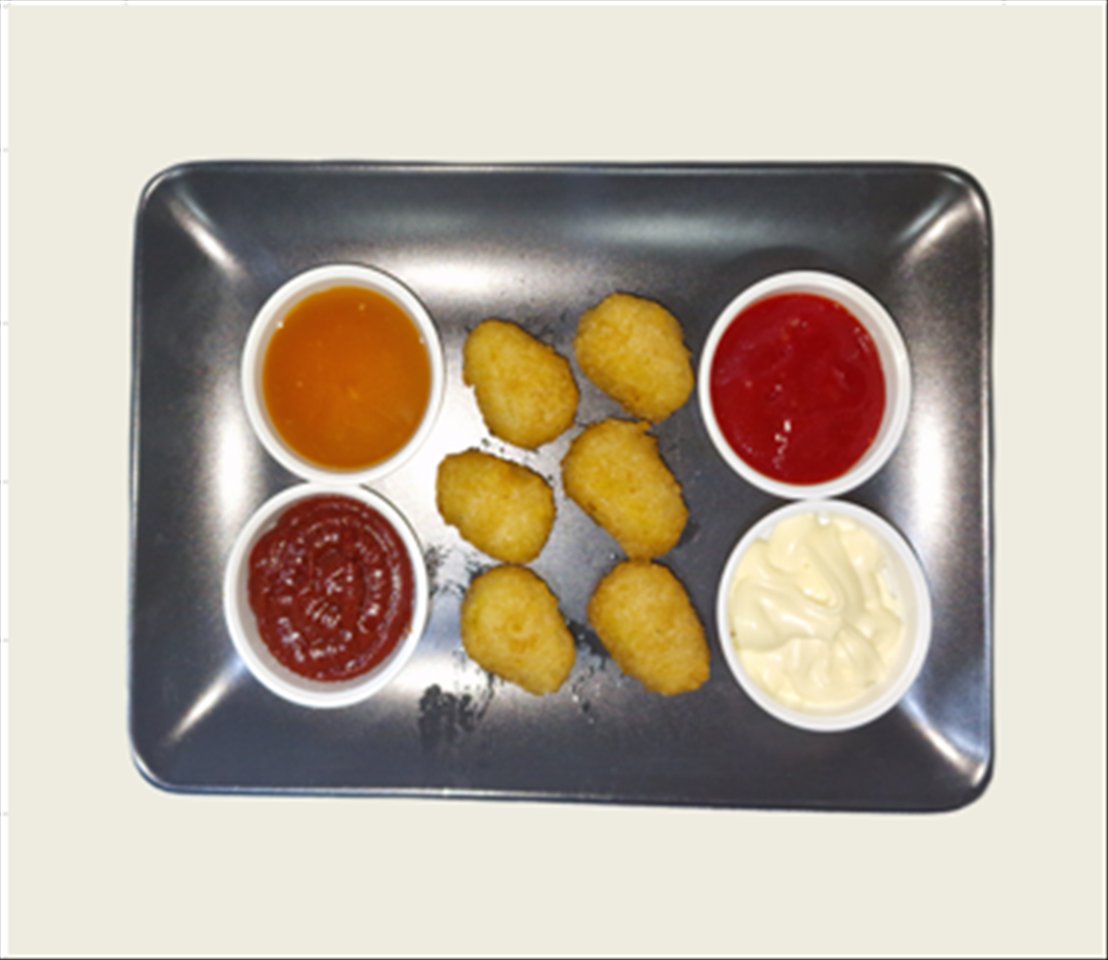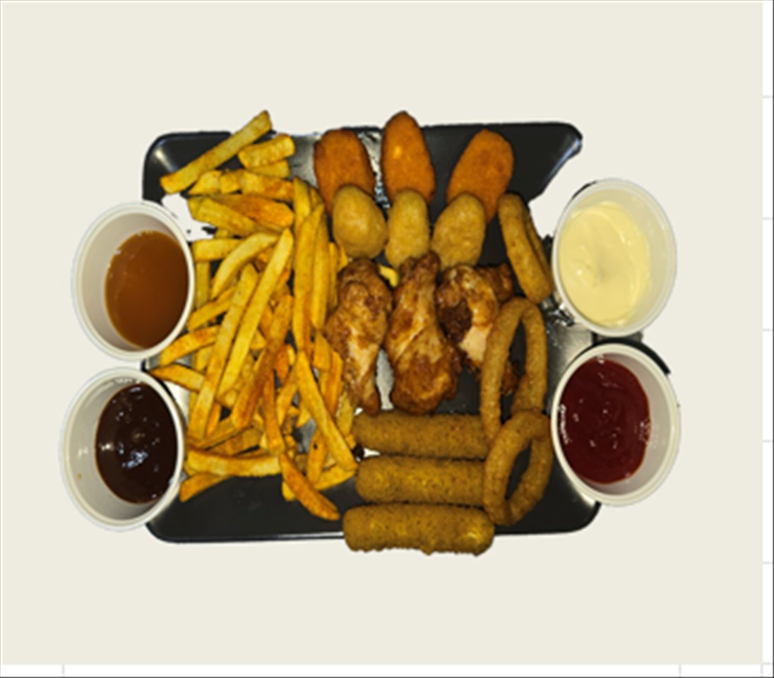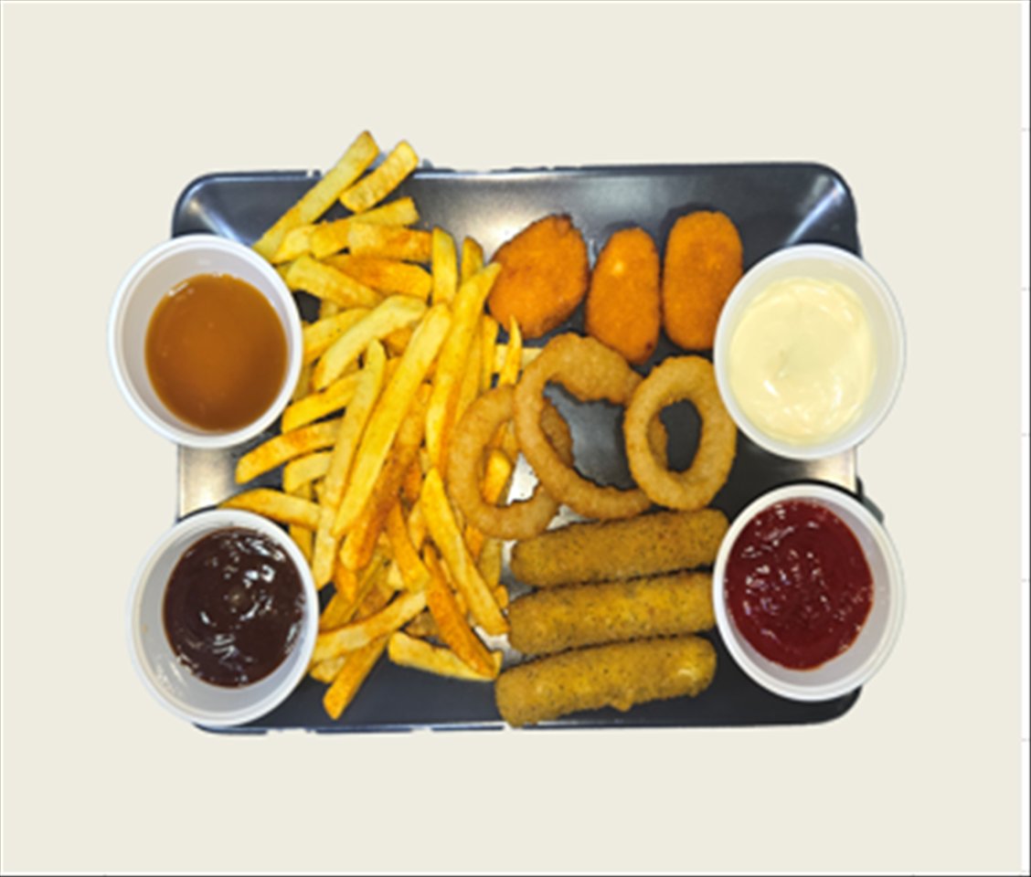 1 x Pommes Frites Portion 3 x Chicken Nuggets 3 x Chilli Cheese Nuggets 3 x Onion Rings 3 x Mozzarella Sticks 3 x Chicken Wings