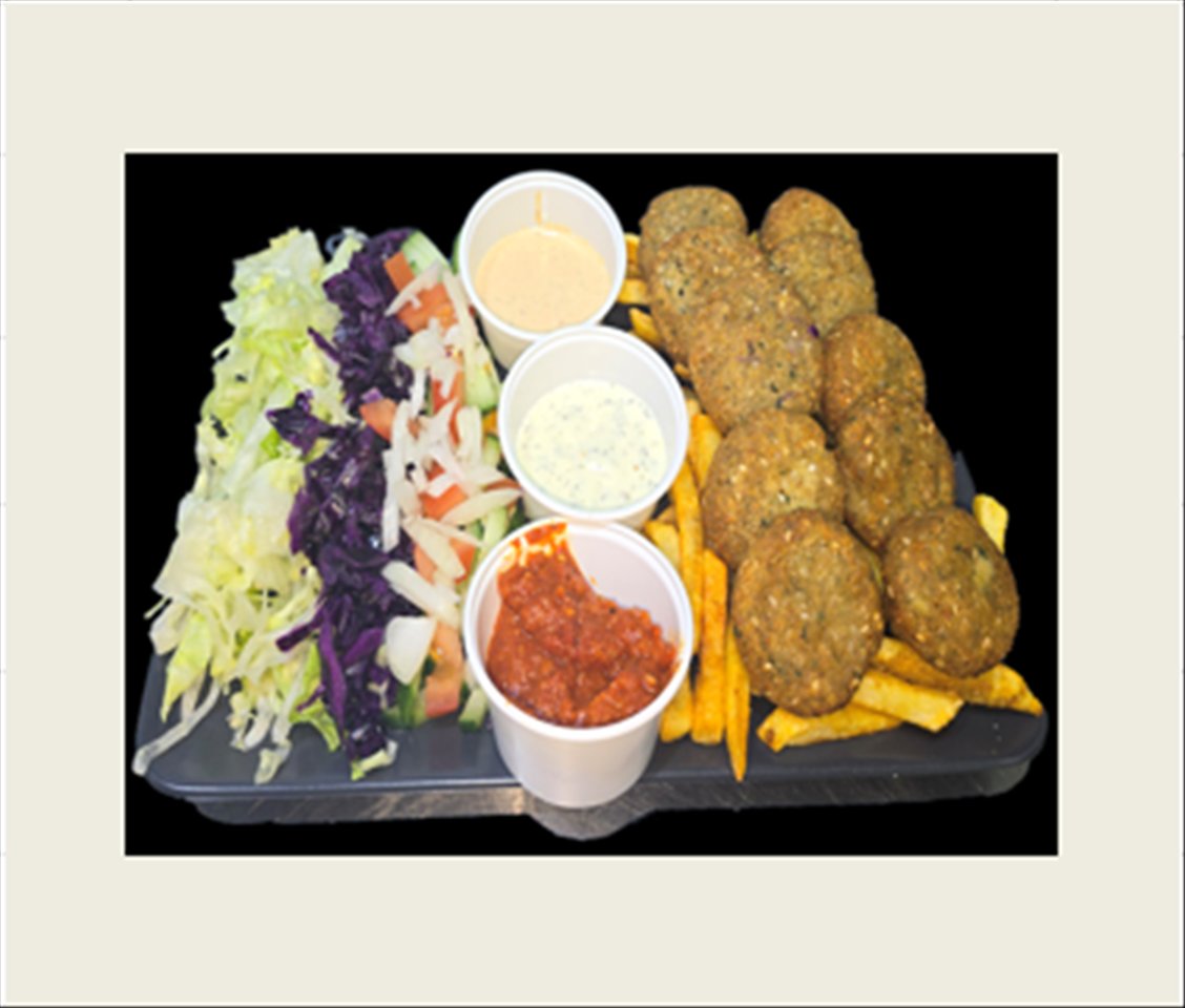 mit Selbst gemachte Falafel (10 Stück), Pommes Frites, Salat und Soße deiner Wahl