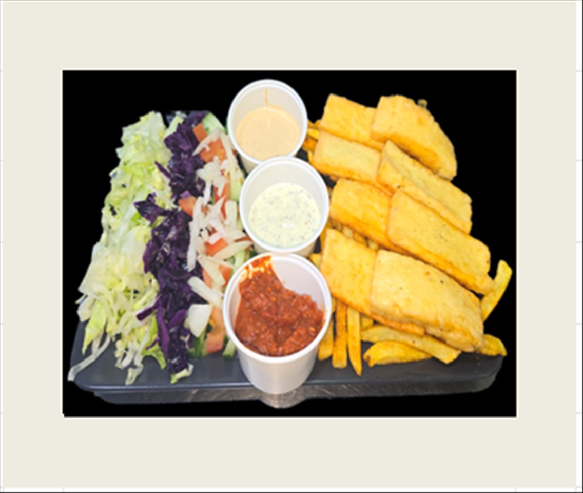 mit Halloumi (8 Stück), Pommes frites, Salat und Soße nach Wahl