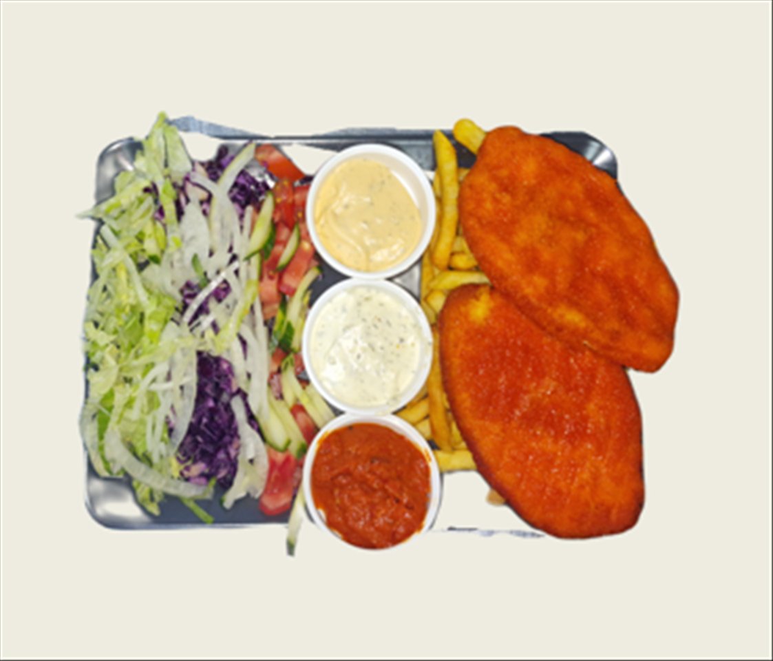 mit selbst zubereitetem Hähnchenbrustfilet, Pommes Frites, Salat und Soße nach Wahl