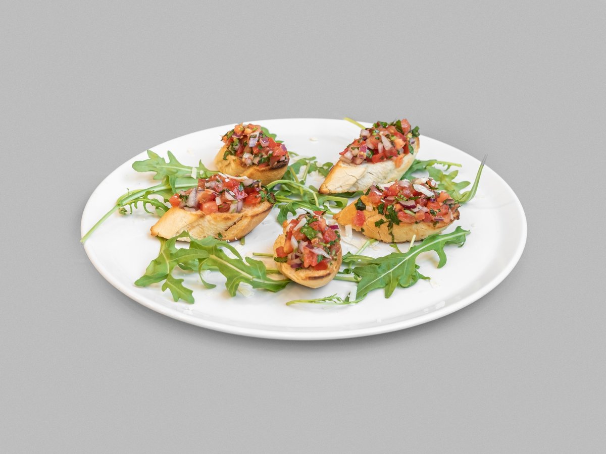 5 Stück geröstetes Ciabatta mit Tomaten, Knoblauch, Petersilie und roten Zwiebeln