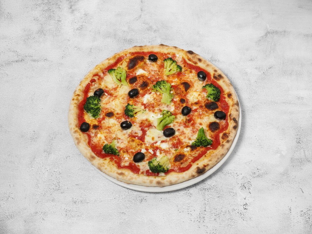 mit Zwiebeln, Paprika, Brokkoli, Mais und Oliven
