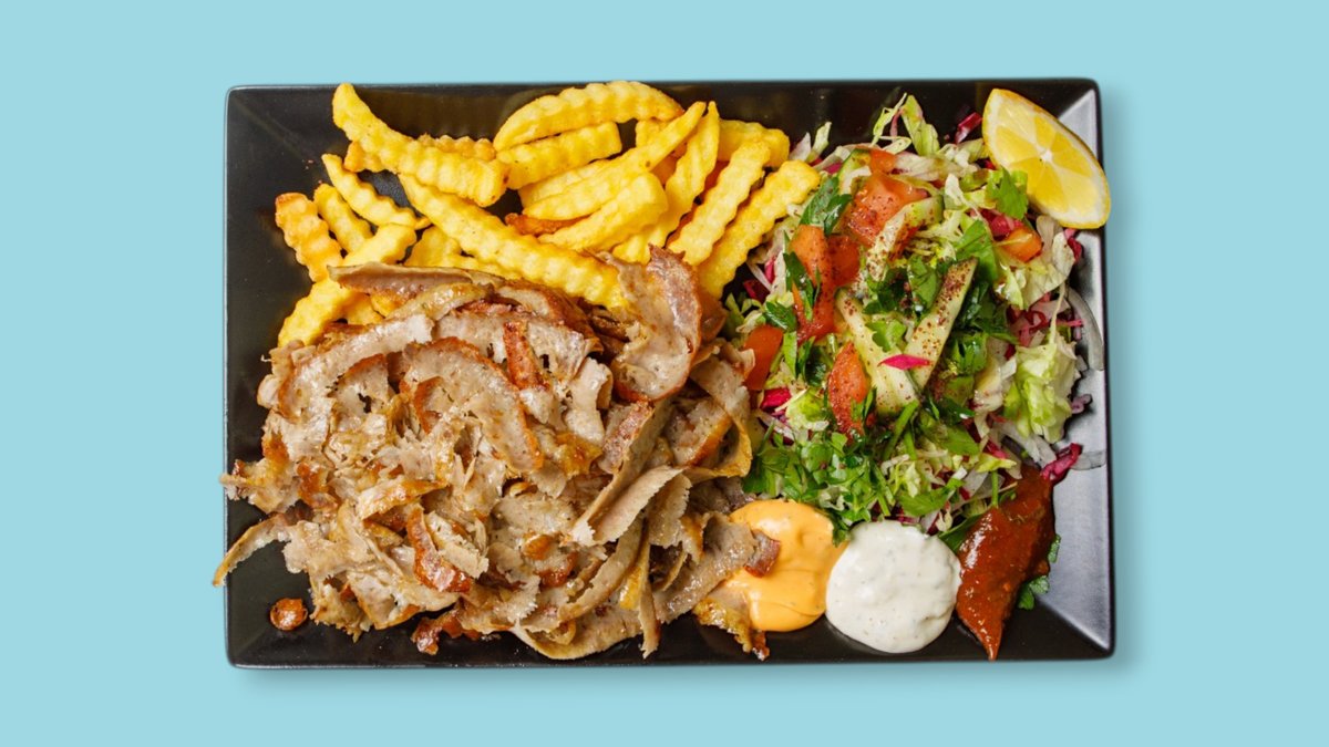 mit Dönerfleisch vom Kalb, Zwiebeln und Peperoni