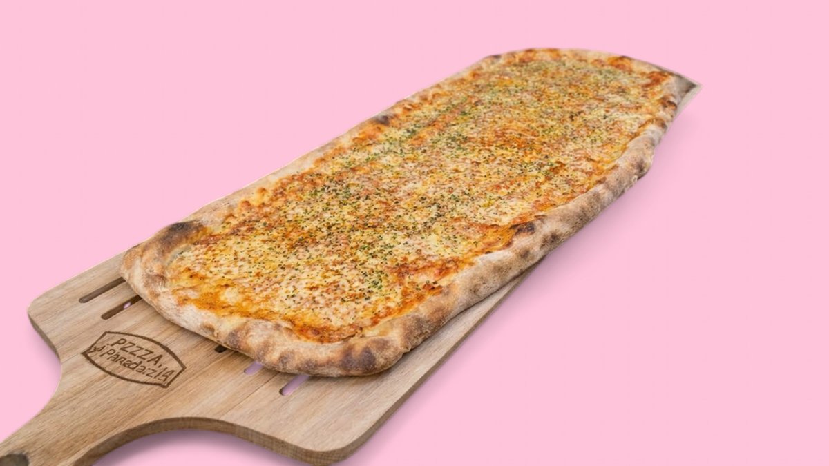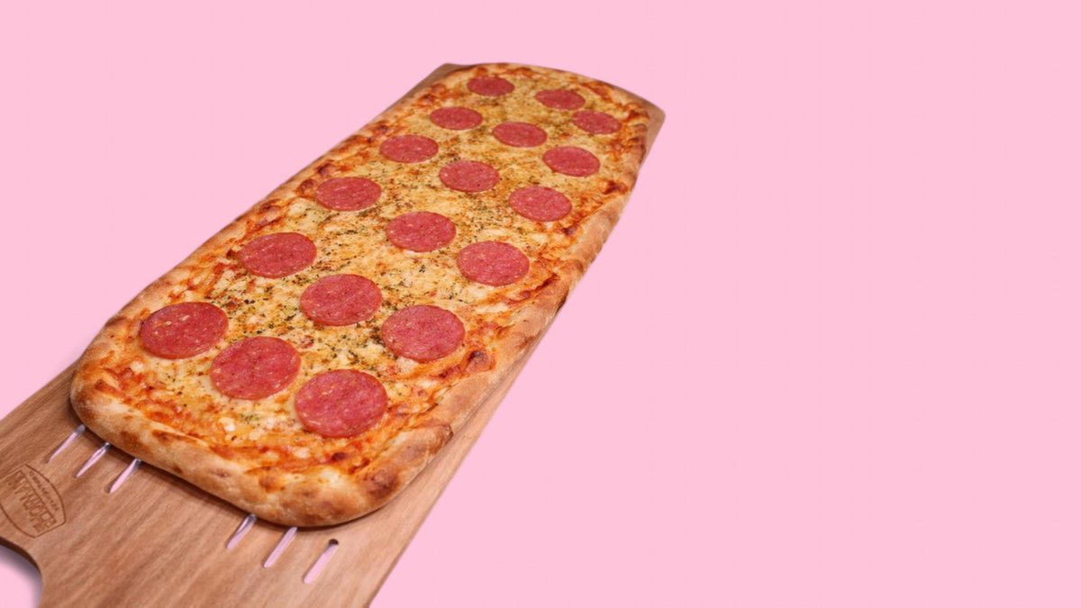 alle Pizzen werden in der Größe von ca. 1 m quadratisch zubereitet und mit Tomatensoße und Käse serviert