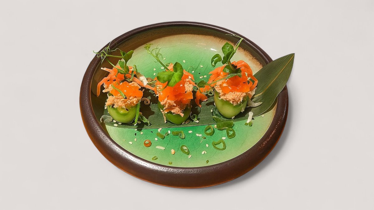 Avocadoschiffchen im Tempuramantel mit veganem Thunfish, Mais, Cherrytomaten, dazu Teriyakisoße und Sesam