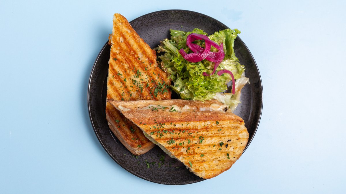 überbackenes Sandwich mit Bergkäse Gruyere, getrüffelten Pilzen, Rosmarinbéchamel, Spiegelei und Salat