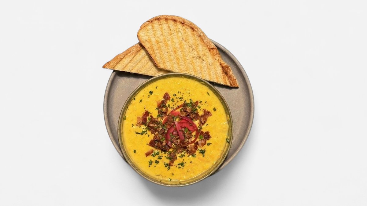 ...mit mit bacon-topping und 2 Scheiben Sauerteigbrot