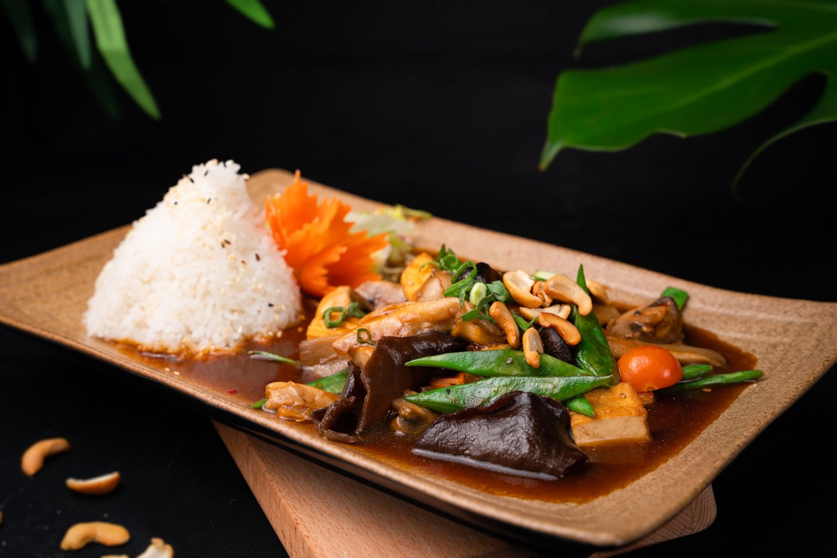 mit im Wok geschwenktem Tofu, Seitan, Champignons, Shiitakes, Tomaten, Bohnen, Zwiebeln, dunkler Soße, Cashewkernen und Jasminreis