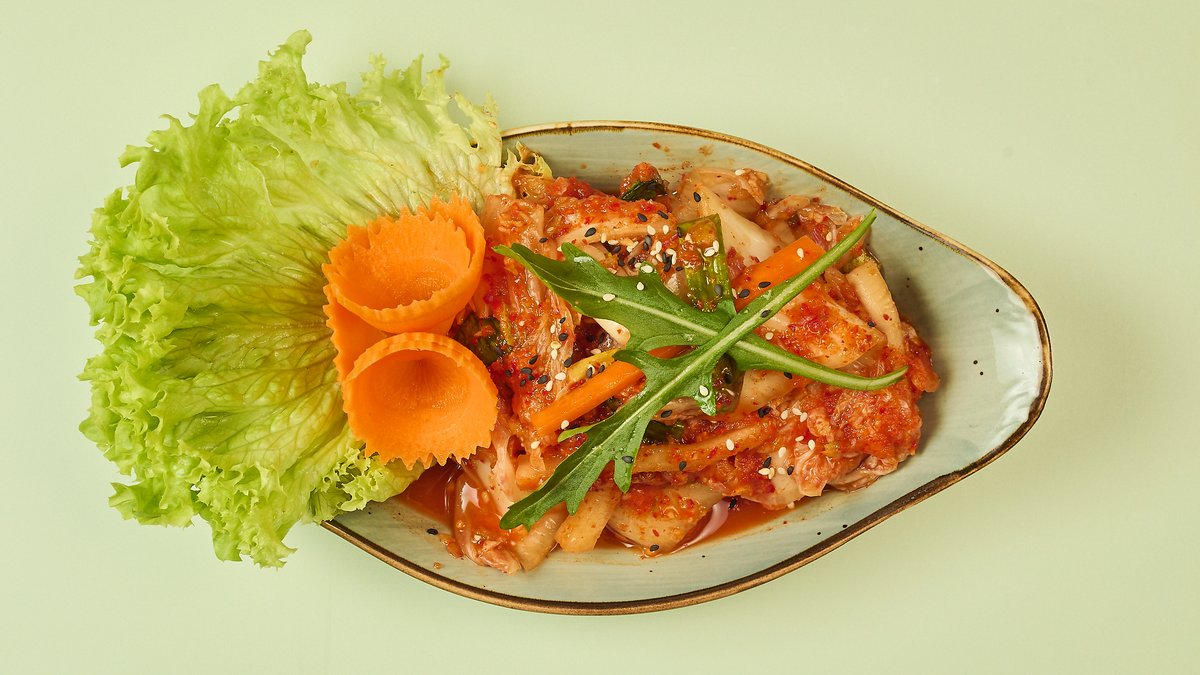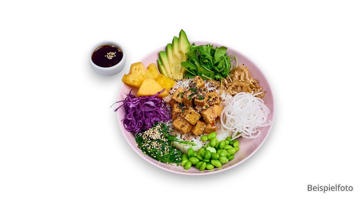 mit frischem Salat, Sojabohnen, Avocado, Mais, Seetang, Kimchi, Jasminreis und einer Zutat deiner Wahl