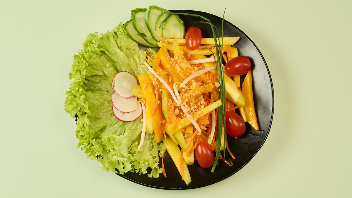 mit frischen Mangostreifen, Sojasprossen, Möhren, Eisbergsalat, Röstzwiebeln, Erdnüssen, Koriander und einer Zutat deiner Wahl