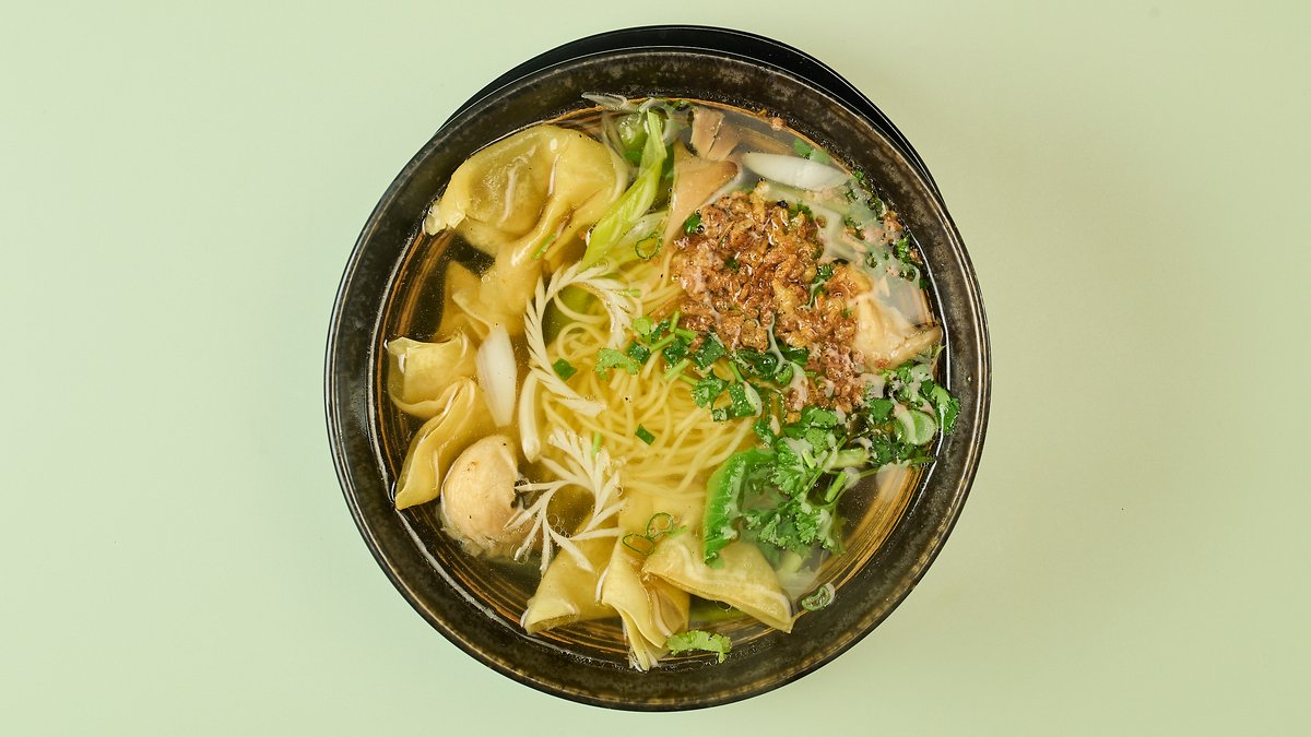 mit hausgemachten Teigtaschen, Gemüse, Sesamöl und Koriander