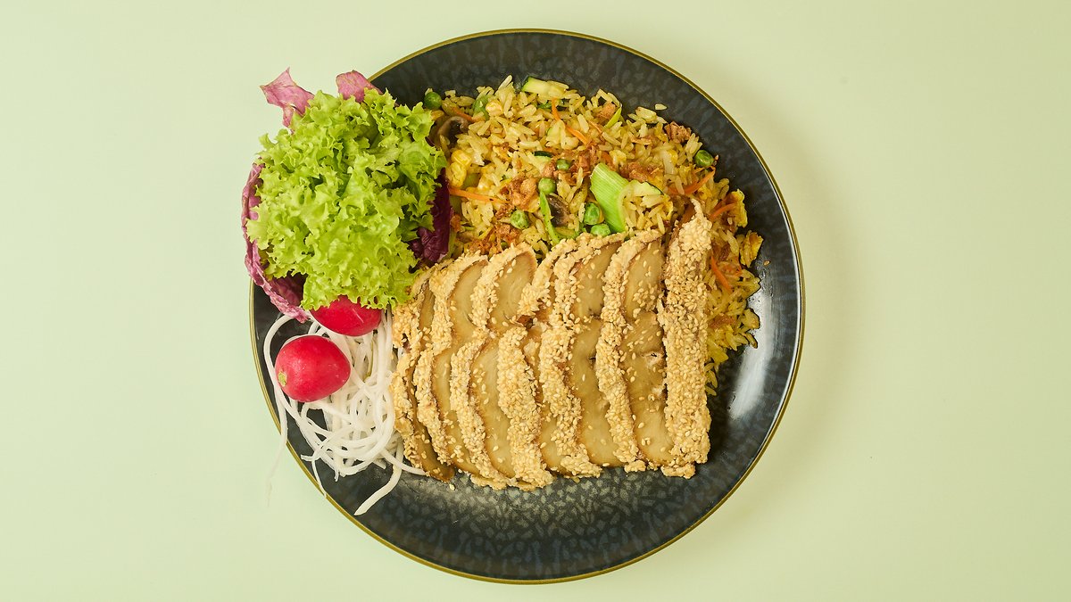 mit saisonalem Gemüse, feuriger Teriyaki-Soße, Jasminreis, Koriander und Seitan-Spießen