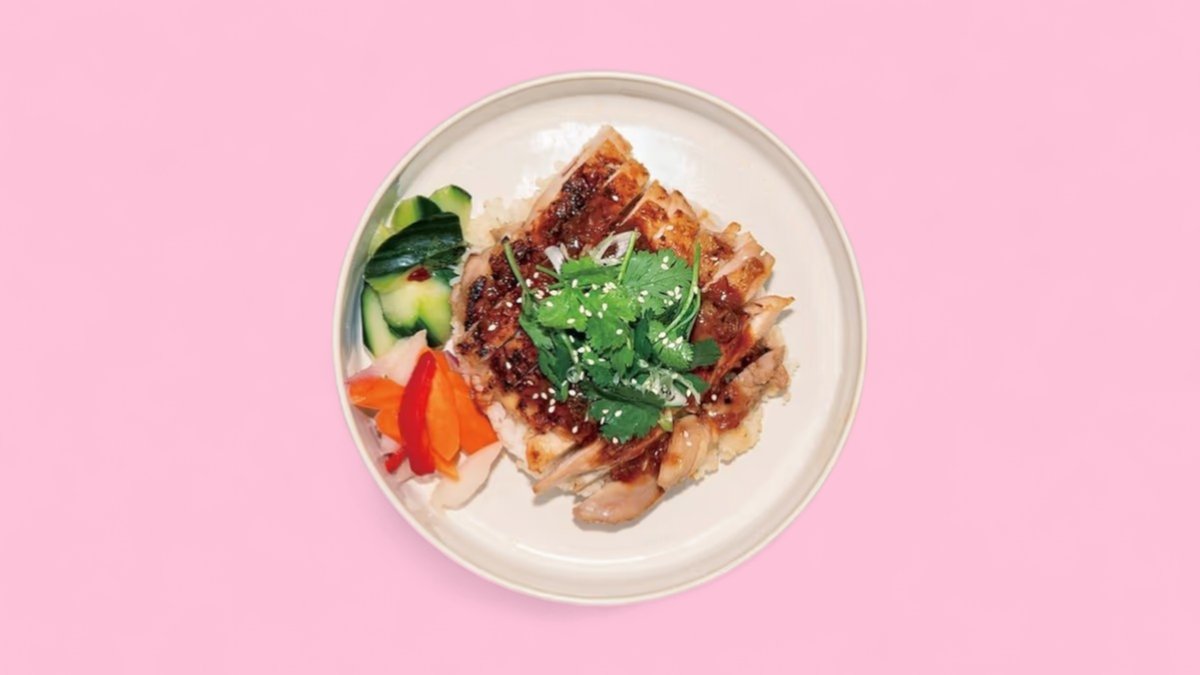 Hähnchenfleisch, zubereitet mit gemischter Miso, Sojasoße, Doubanjiang, Ingwer und Knoblauch, dazu Gurken-Minz-Marinade, Szechuanpfeffer-Pickles, Karotten, Daikon, Paprika und rote Zwiebeln – auf Reis