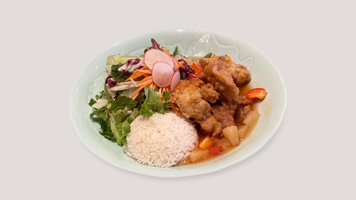 Knusprig doppel gebackene Hühnerstreifen mit Ananas-Süß-Sauer-Söße, frischen gemischt Salat mit Kräuter. Dazu Jamin Reis.