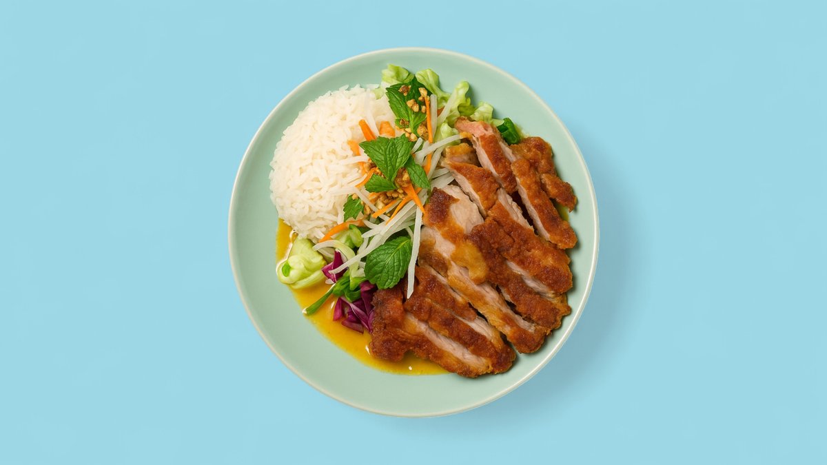 mit einer Zutat deiner Wahl, Kokoscreme, Salat, Kräutern und Jasmin-Reis, verfeinert mit gerösteten Erdnüssen und Zwiebeln Das Bild dient zur Anschauung und zeigt das Gericht mit knuspriges Hähnchen als Zutat