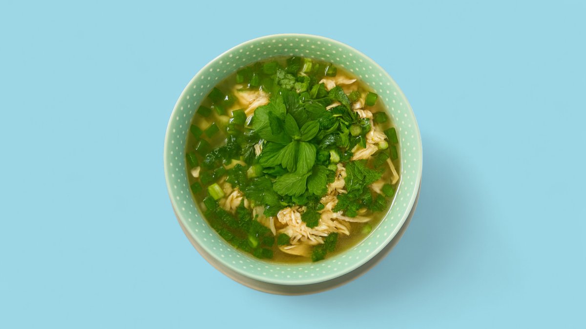 kleine Suppe mit Hühnerfleisch, getoppt mit vietnamesischem Kräutern