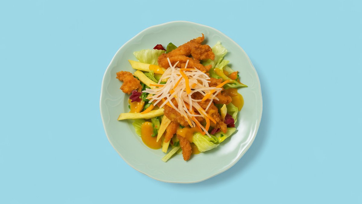 mit einer Zutat deiner Wahl, Reiskugel, frischen Mangostreifen, knackigem Salat und Kräutern, getoppt mit gerösteten Zwiebeln und Erdnüssen, serviert mit hausgemachtem veganen Limetten-Dressing und Mangosoße Das Bild dient zur Anschauung und zeigt das Gericht mit Hähnchen als Zutat