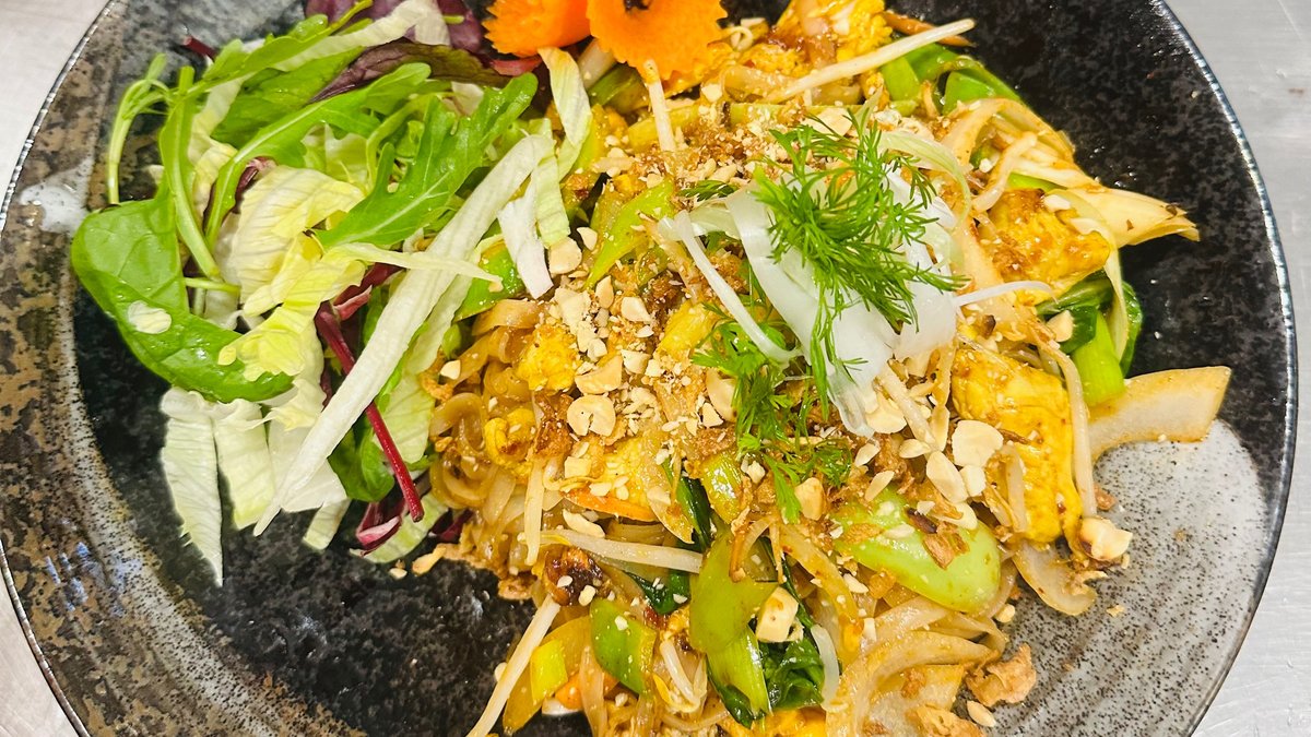 gebratene Reisbandnudeln mit Ei, Porree, Karotten, Pak Choi, Sojasprossen, Frühlingszwiebeln, Röstzwiebeln, hausgemachter Soße und frischem Koriander