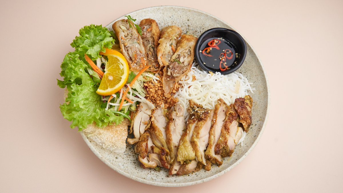 mit knusprigen Frühlingsrollen, gegrillten Hähnchenkeulen auf Reisnudeln, Salat, Tamarinde-Dressing und einer Zutat deiner Wahl