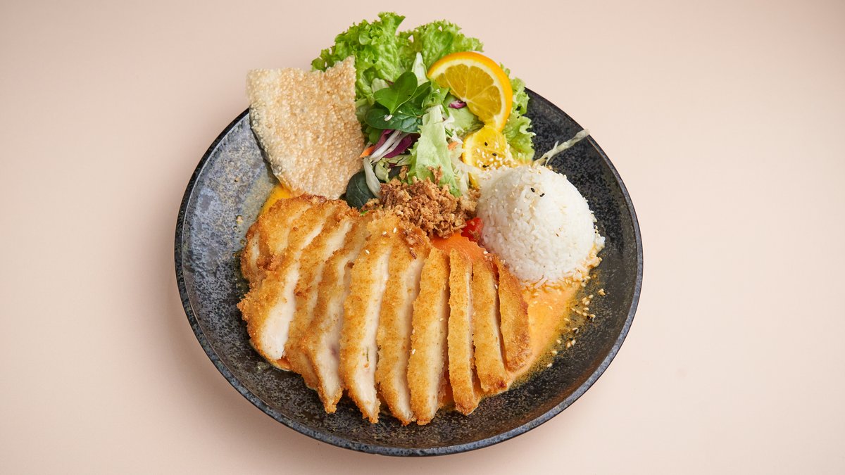 mit Tempura-Tofu, roter Curry-Kokossoße, Gemüse, Reis und Süßkartoffel Pommes