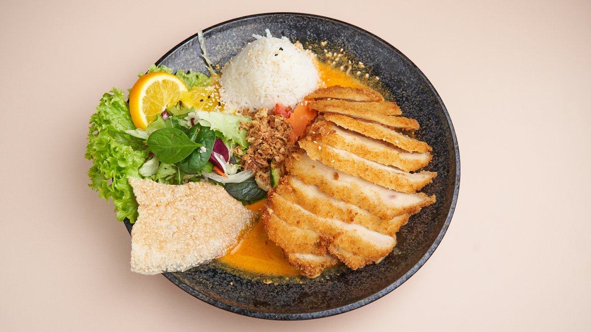mit roter Curry-Kokossoße, Gemüse, Salat, Basilikum, Champignons, Duftreis und einer Zutat deiner Wahl