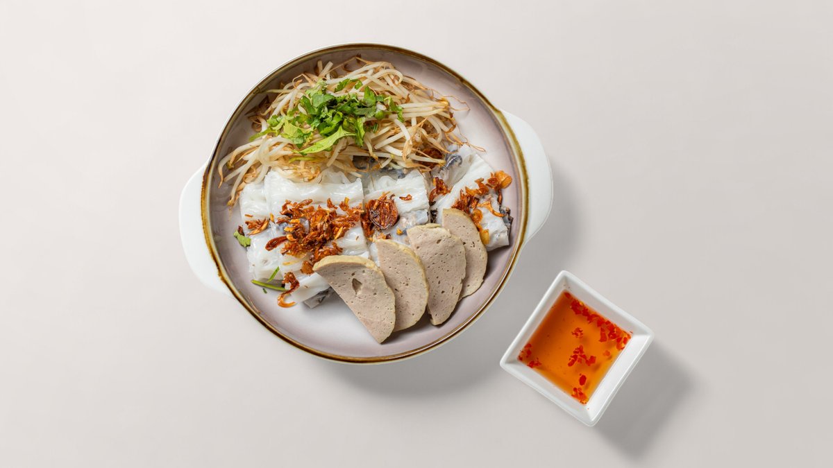gedämpfte Reismehl-Crepes, wahlweise mit veganem Fleisch, Garnelen oder Tofu, serviert mit frischen Kräutern, Sprossen und Süẞ-Saurer-Fischsoße
