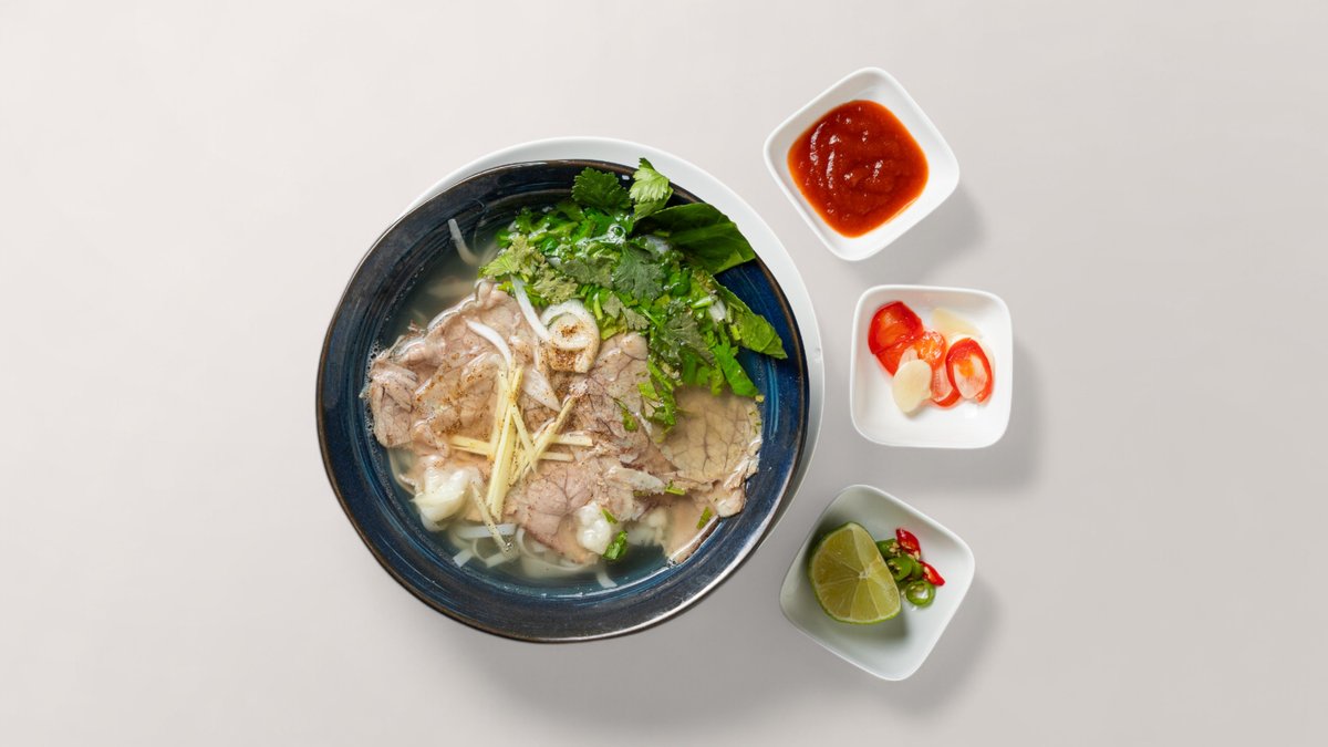 traditionelle Rindfleischsuppe mit Reisnudeln, frischen Kräutern, Limette und Chili
