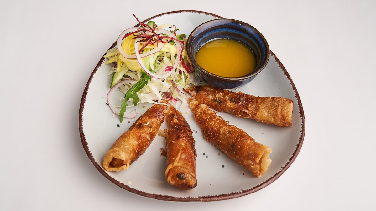 mit knusprigen Frühlingsrollen, Reisnudeln und gerösteten Erdnüssen in einer Chili-Limetten-Soße