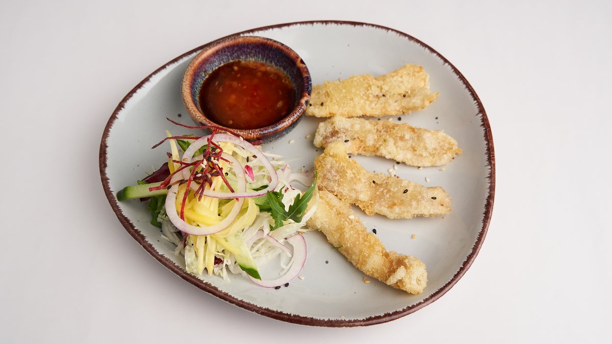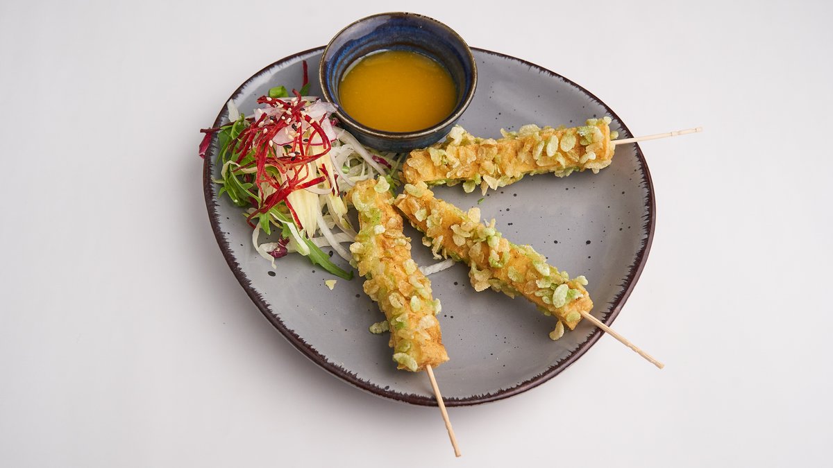 weiche Tofusticks ummantelt mit knusprigen grĂĽnem Reis, und mit Mango-Dip zubereitet