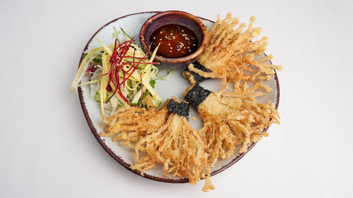 paniert Enokipilze in Seetang gewickelt mit SĂĽĂź-Chili-Dip