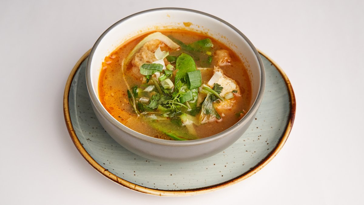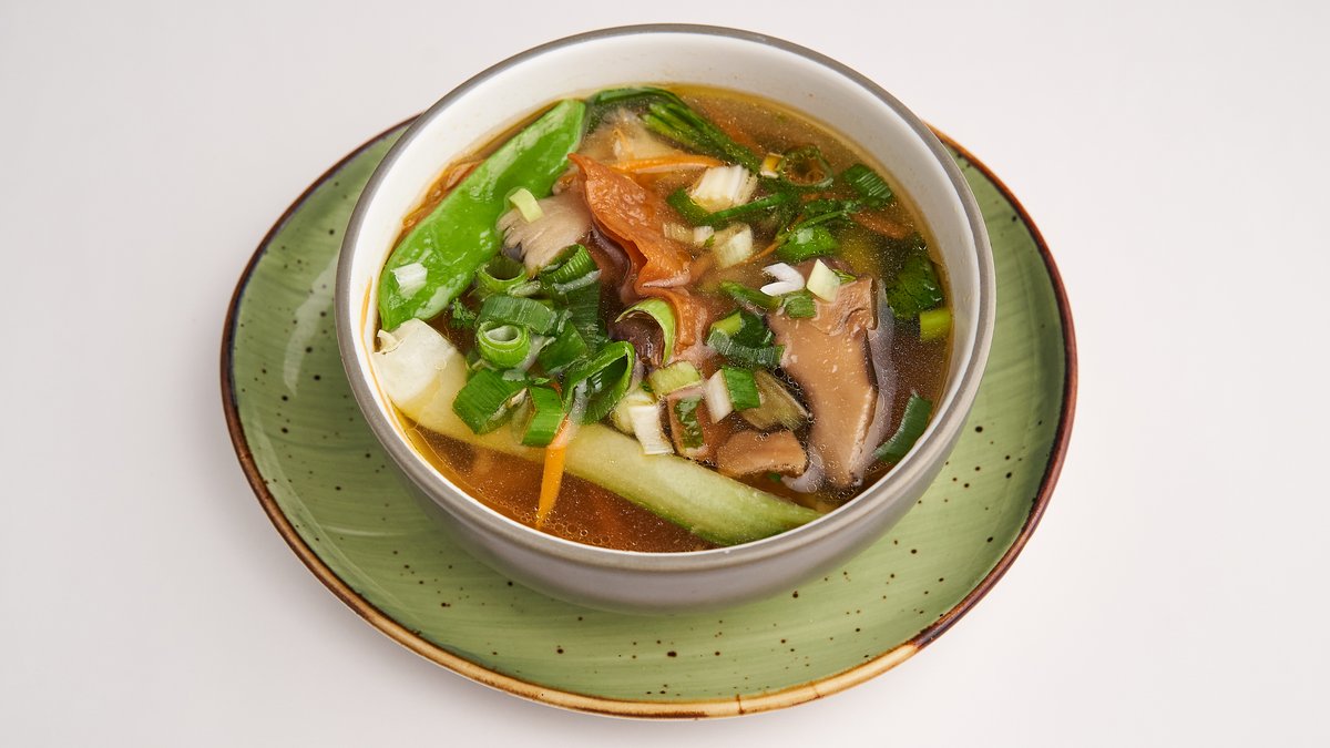 wĂĽrzig GemĂĽsebrĂĽhe mit Pakchoi, Champignons und hausgemachten Wan-Tan