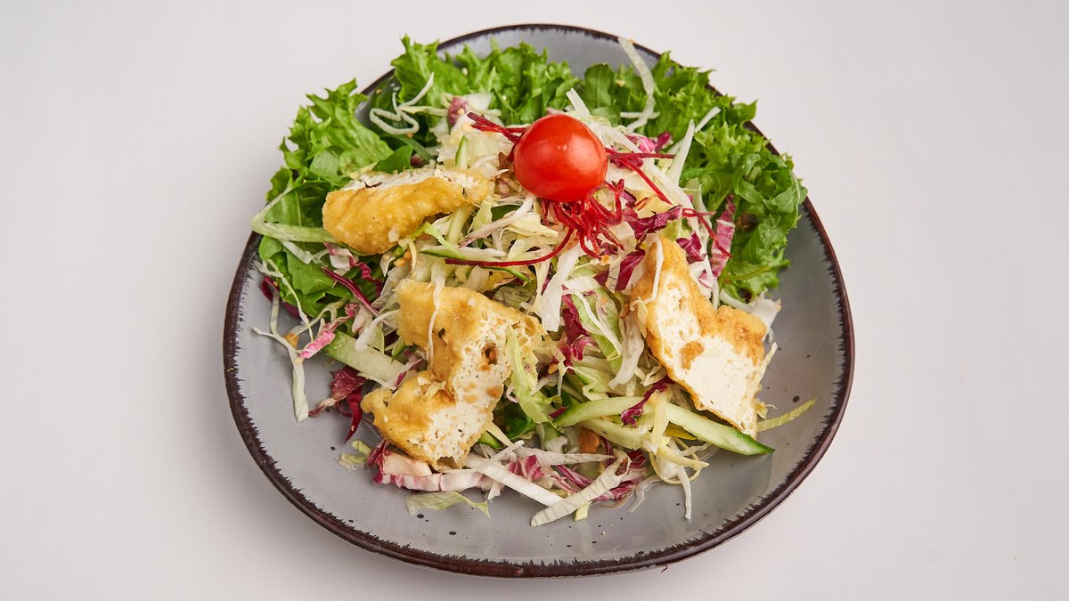 mit FrĂĽhlingsrollen, frittierten Enoki, Sommerrollen, Wantans, Pilzmixsalat und Tofu mit Reismantel