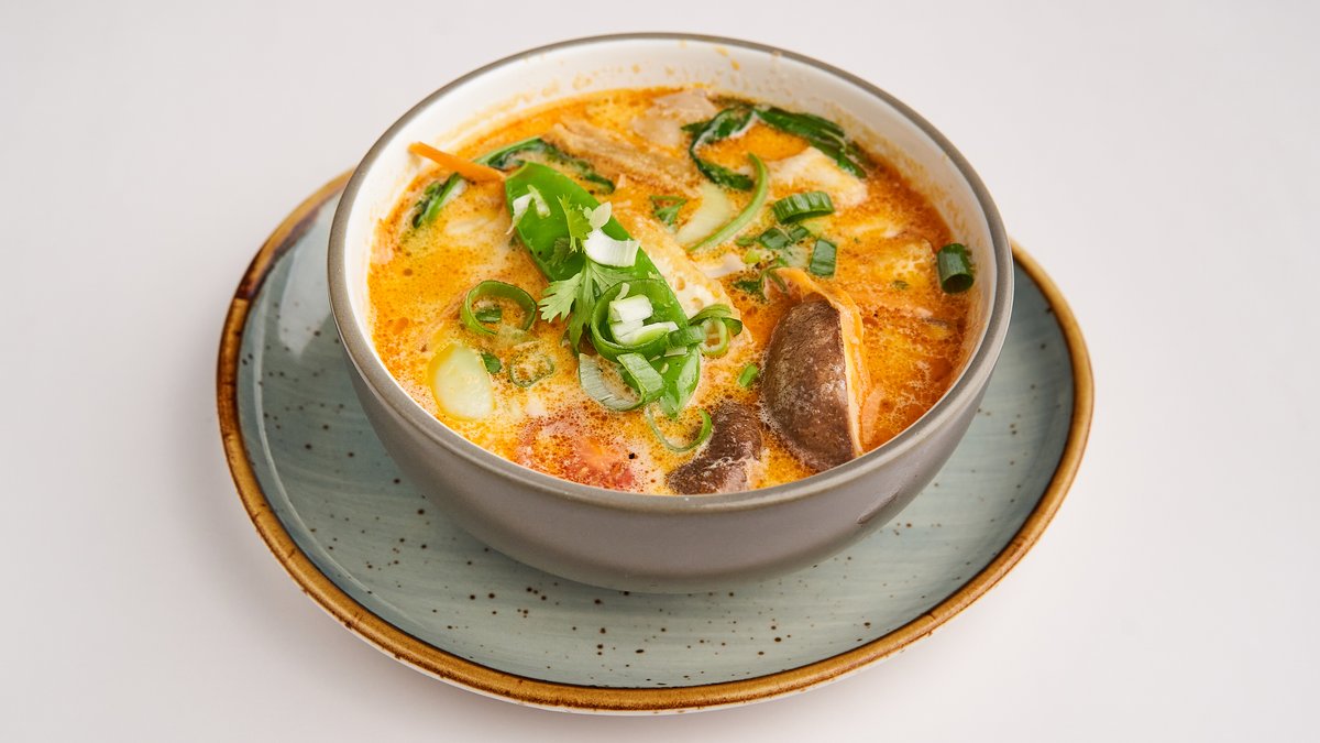 Kokossuppe mit Tofu, Kirschtomaten, Kaiserschoten und Champignons