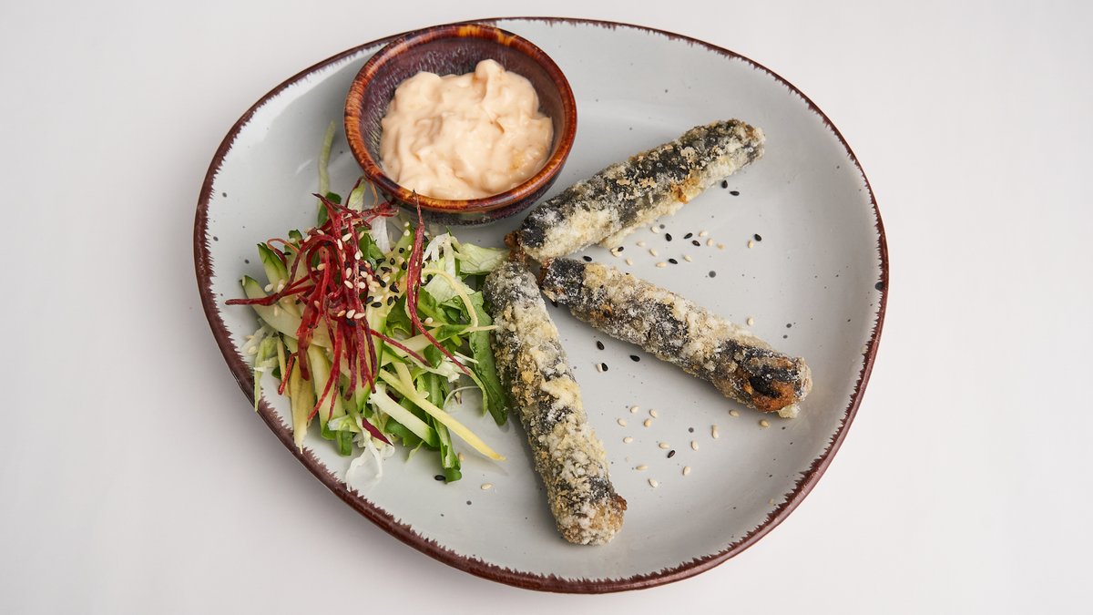 veganer Backfisch aus Tofu und SĂĽĂźkartoffeln, mit Seetang umwickelt und mit veganer Chili-Mayonnaise serviert