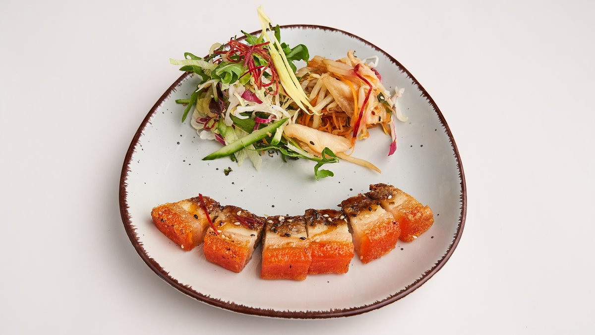 veganer Schweinebauch aus Taro mit Kruste und pikantem Kimchi