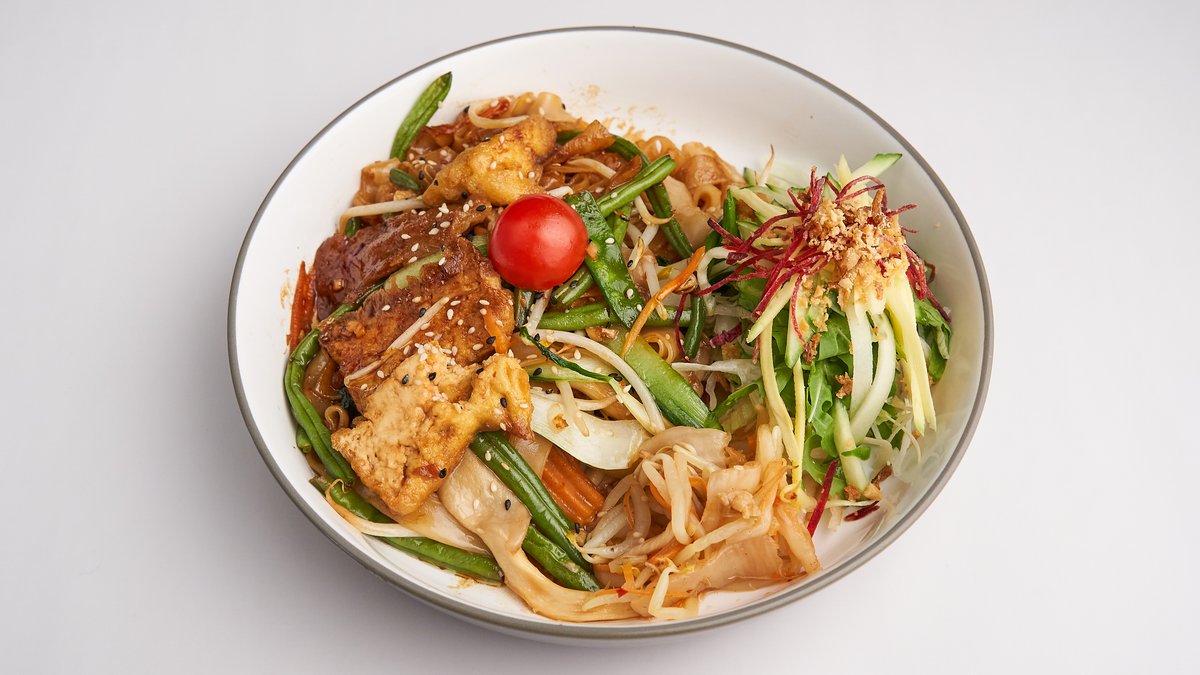 mit gebratenen Reisbandnudeln, Tofu, Seitan, Kräuterseitlingen, Gemüse und gerösteten Erdnüssen