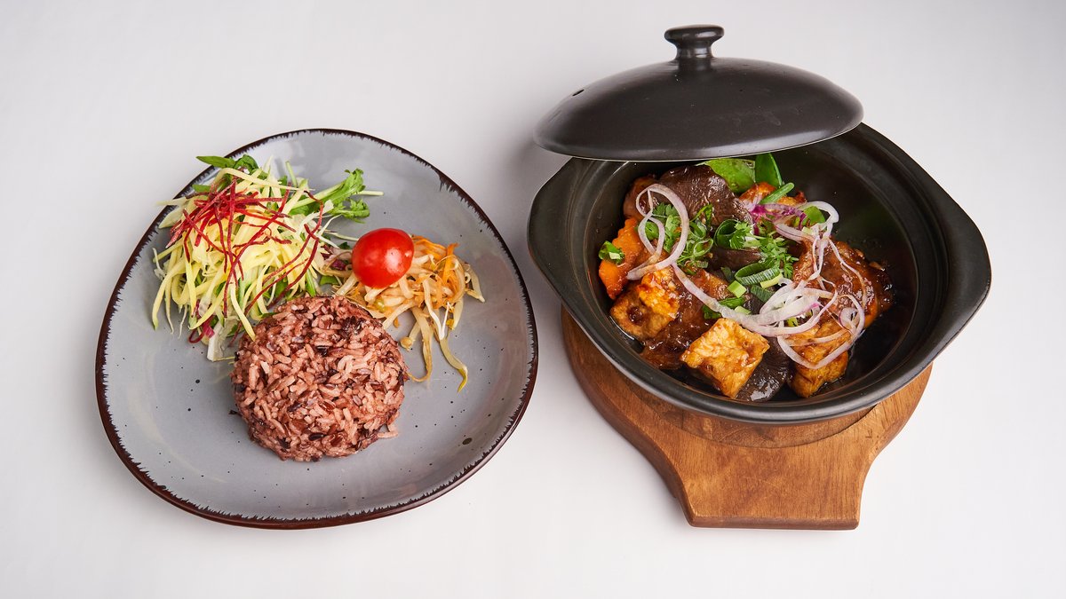 mit geschmorten Auberginen, Tofu, Seitan und dunkler veganer HaussoĂźe