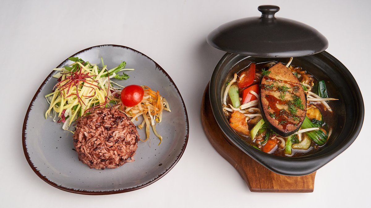 pikant Zitronengrassuppe mit Reisnudeln, Kräuterseitlingen, Tofu und Seitan, serviert in heißem Steinpot