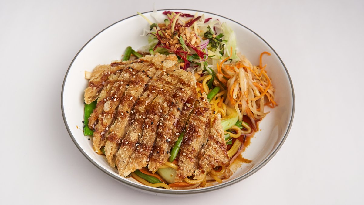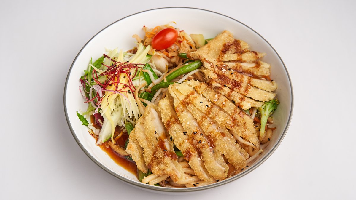 Udon-Nudeln mit krossem Hähnchen, Gemüse hausgemachtem Pesto und gerösteten Erdnüssen