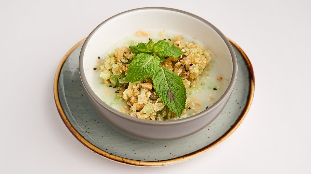 frittierte Bananenbällchen mit grünem Reismantel, Kokosnuss-Tapiokacreme, Erdnüssen, Sesam und veganem Honig