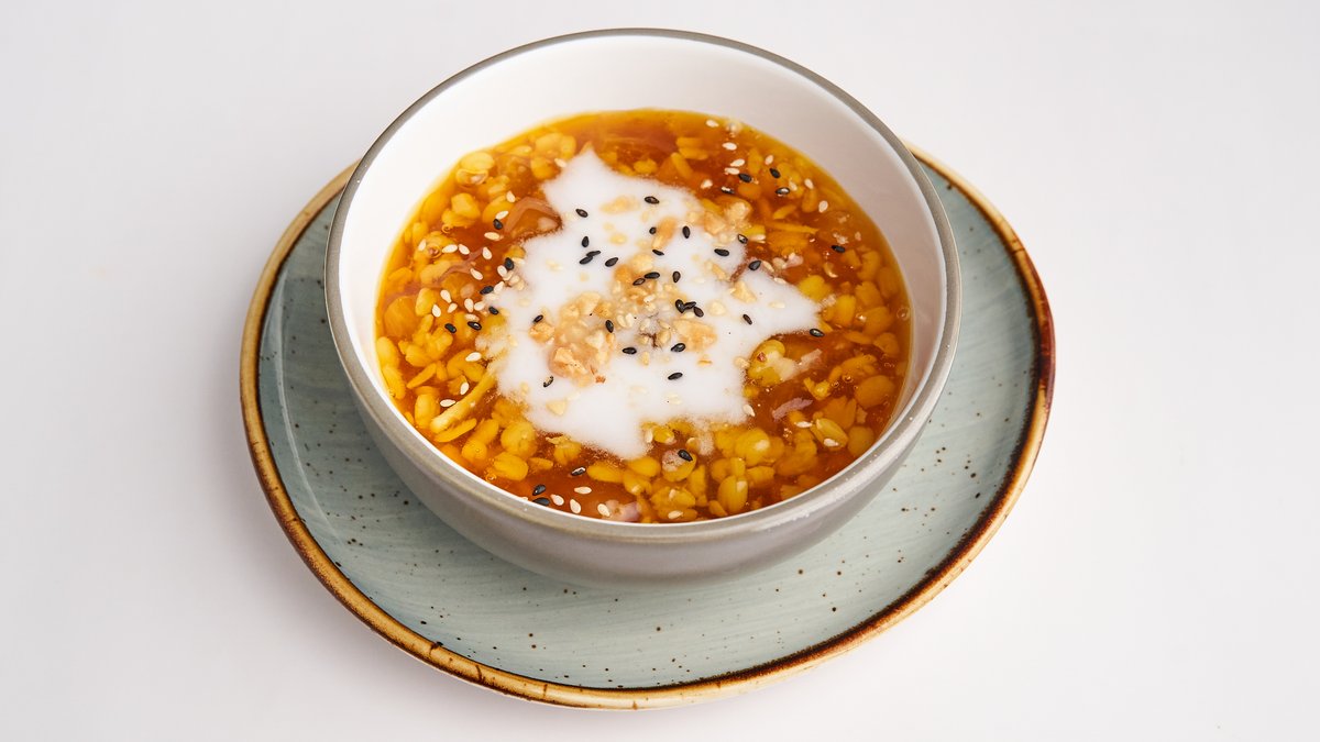 sĂĽĂźer Pudding mit Mungobohnen und Grapefruitschale, serviert mit Kokoscreme und Sesam