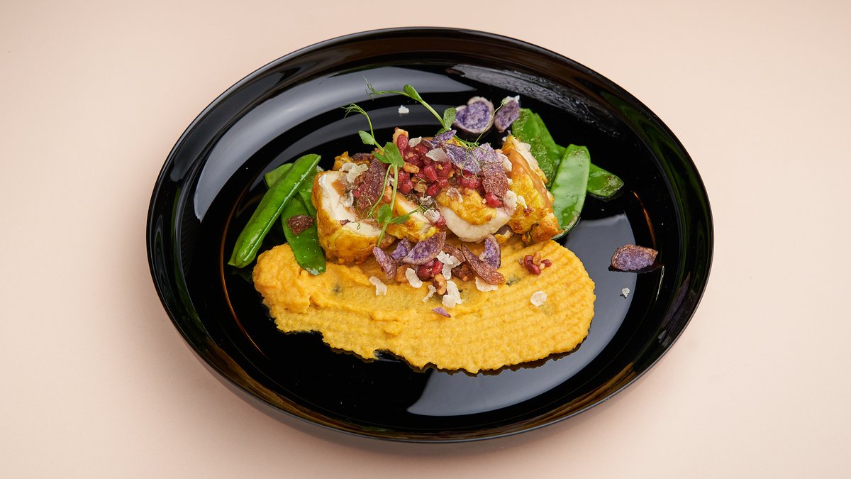 mit Orangen-Jus, Hokkaido Kürbis, Pak Choi, Bimi und TrüffelKartoffelpüree „Peking Art“