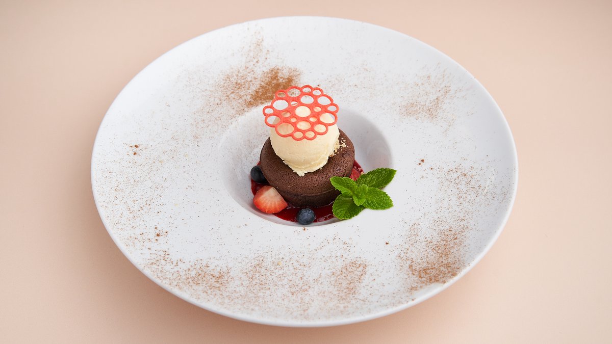 mit Beerencoulis und Eiscreme Das Gericht wurde mit Schokolade zubereitet und kann Spuren von verschiedenen Nüssen enthalten