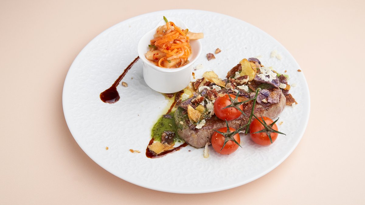 200 g mit Tomaten-Kapern-Soße und hausgemachtem nach koreanischer Art vorbereitetem Kimchi