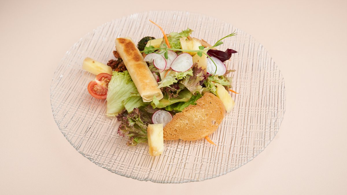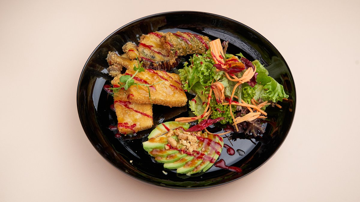 mit Senf-Vinaigrette, japanischem Tempuragemüse, Yuzusalat und Tamarinde-Avocado