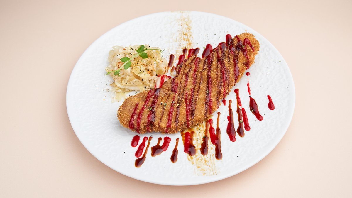 190 g mit japanischem Duroc-Schweineschnitzel, Krautsalat und hausgemachter Teriyaki-Soße
