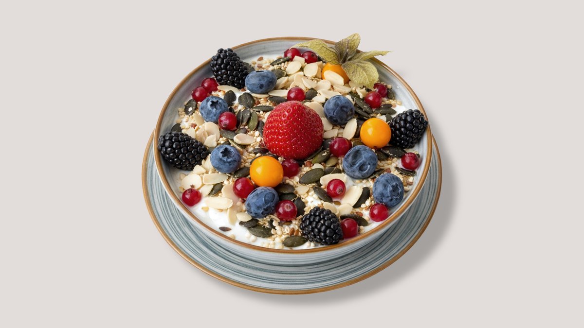 alle Gerichte werden mit frischem Obst, Beeren, hausgemachtem Granola, verschiedenen Nüssen, Kernen und Samen zubereitet