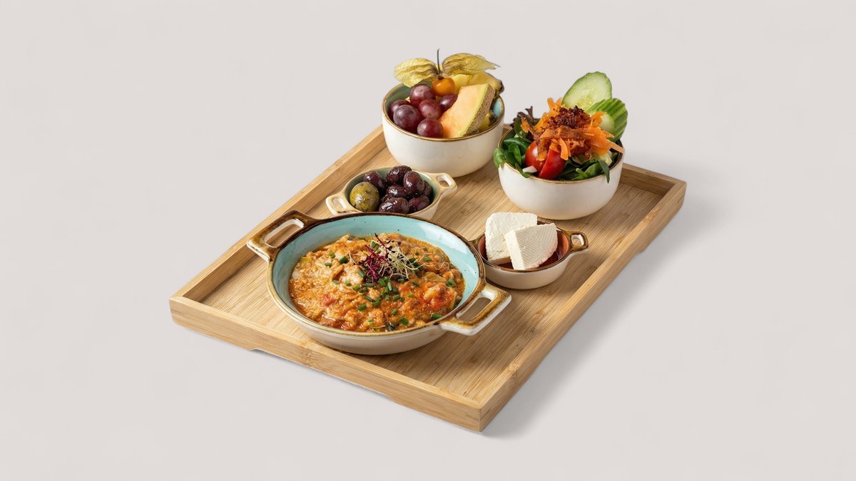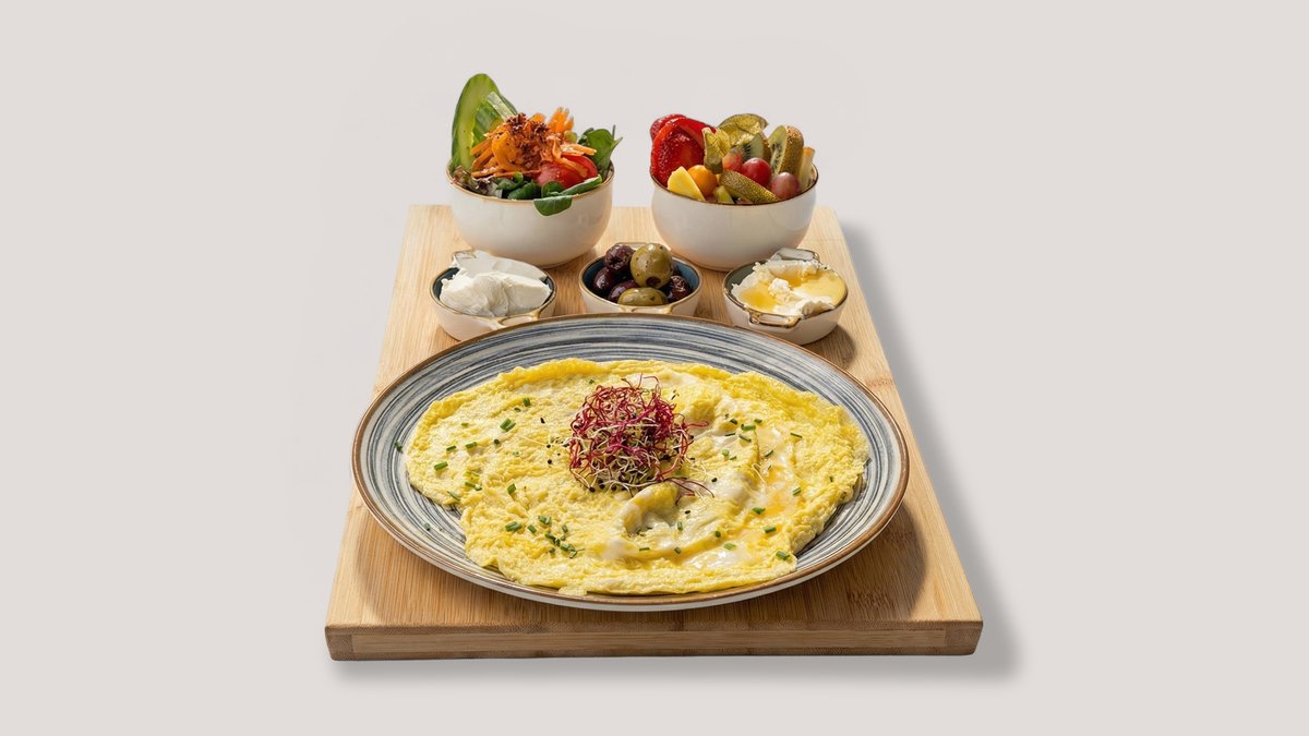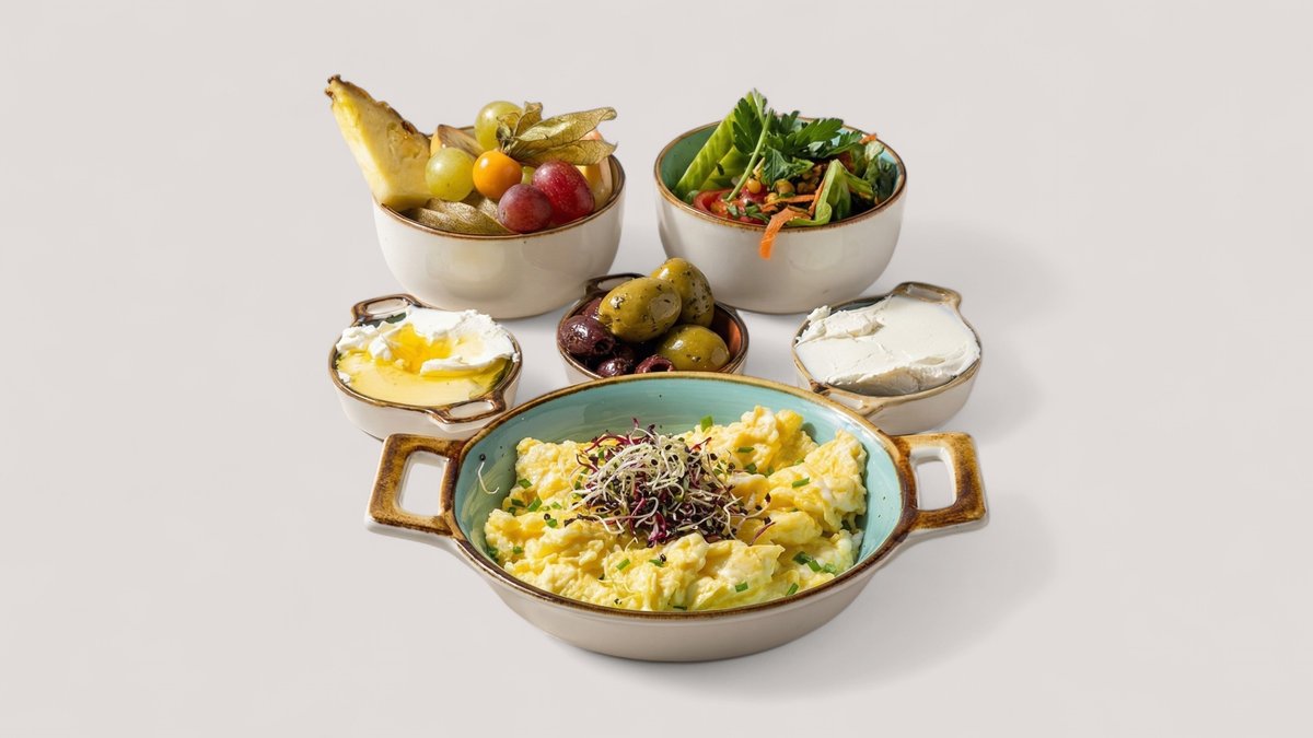Frühstücksplatte mit drei Eiern aus nachhaltiger Haltung in einer Zubereitungsart deiner Wahl, Brie, Butter, Frischkäse, Knoblauchwurst vom Rind, Mozzarella, Oliven, Rahm, Honig, Salami vom Pute, Weichkäse und saisonalem Obst